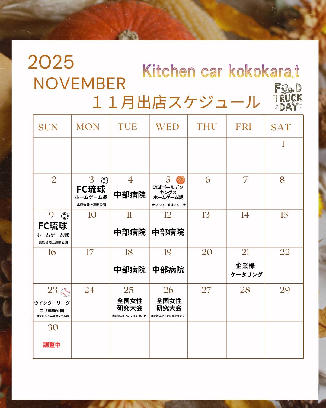 【キッチンカー】11月出店スケジュールのお知らせ Posted 2025年10月31日 by iL2tJPWxFQ62 Tweet いつも「居酒屋ここから」のホームページをご覧いただき、ありがとうございます。 キッチンカーの営業スケジュールは下記カレンダー通りとなります。 出店日や出店場所など、最新の営業情報をご確認いただけますので、ご来店の際の参考にぜひご覧ください。 皆さまのご来店を心よりお待ちしております。